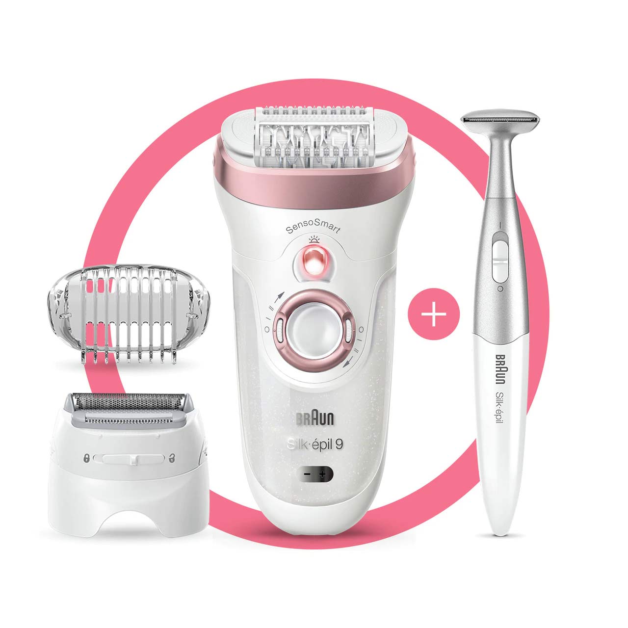 View epilatorsEpilator, Silk·épil 9, Rose Gold with 7 extras including bikini trimmer